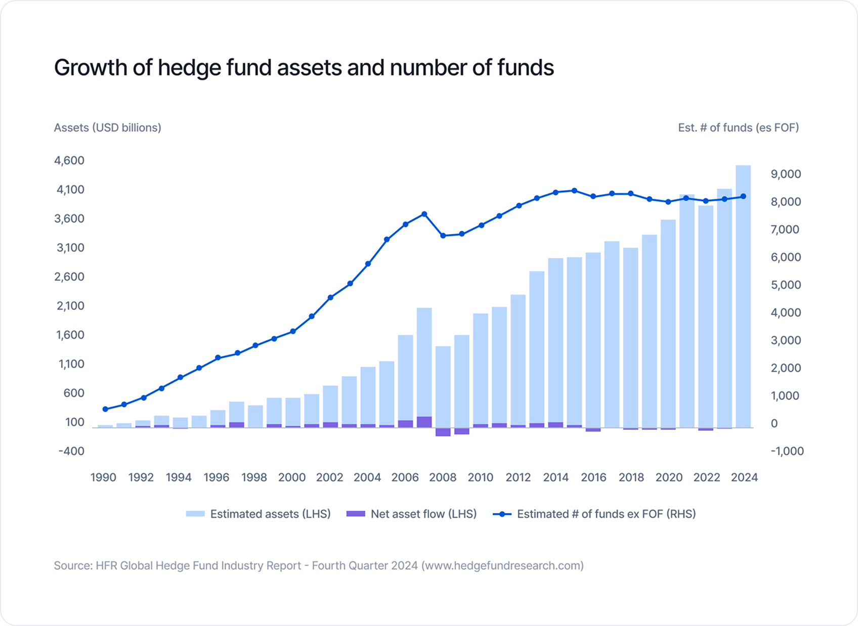 Recent shifts in market dynamics have heightened company-specific risk, which can be seen as expanding the opportunity set for skilled hedge fund managers. Reflecting this momentum, HFR reports that global hedge fund assets reached approximately $4.5 trillion by end-2024, an increase of $401.4 billion over a year.