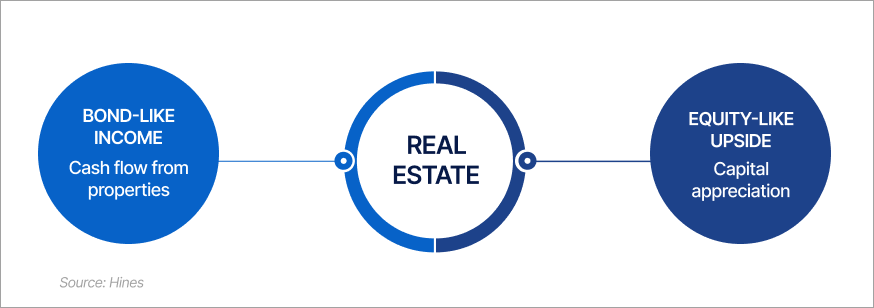 Private real estate has a unique hybrid quality, combining bond-like characteristics with equity-like growth potential.